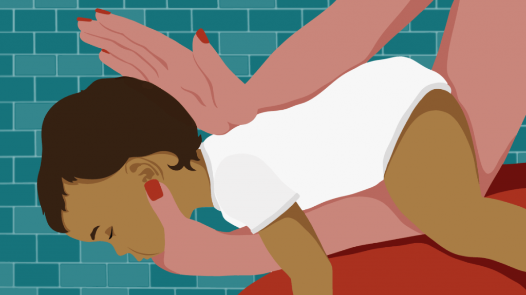 For a baby under one year: Lay the baby face down across your lap and use the heel of your hands to give a back blow, give 5 blows in the middle, these blows create a vibration that should dislodge the object